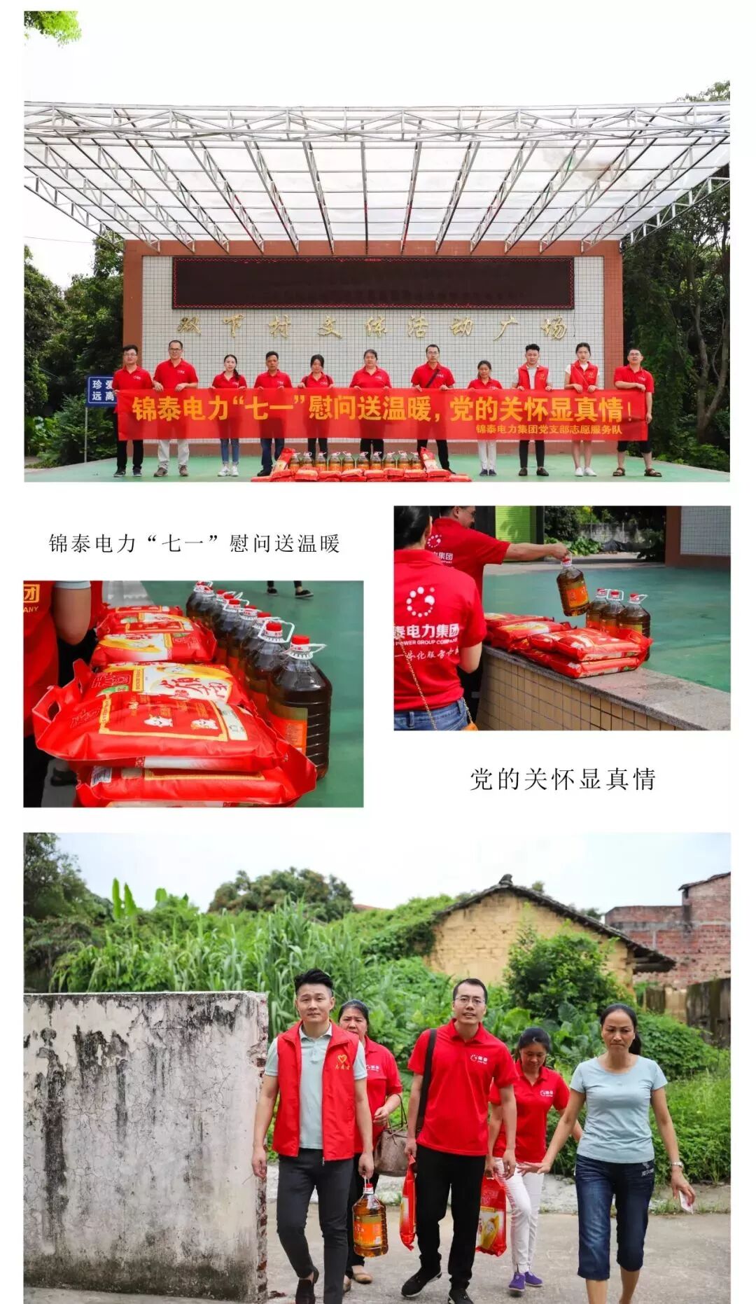 七一前夕,献礼党建,处处洋溢着喜庆的红色气息。6月30日,在建党日到来之际, 锦泰电力集团党支部书记欧远珍、锦泰电力集团副董事长陈辉明携集团党支部志愿服务队,来到河源市源南镇双下村开展“七一”慰问送温暖活动,代表集团及党支部,为村内的贫困家庭送去慰问品和祝福,宣扬党与企业的关怀和温暖。